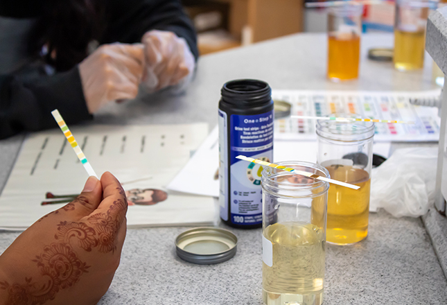 This session included a urinalysis practical using urine dipsticks to identify factors indicative of type 1 and type 2 diabetes. Students were given 3 patient profiles and samples to test and decide on likelihood for diabetes diagnosis. Using their critical thinking, students determined which patients were at risk of diabetes.